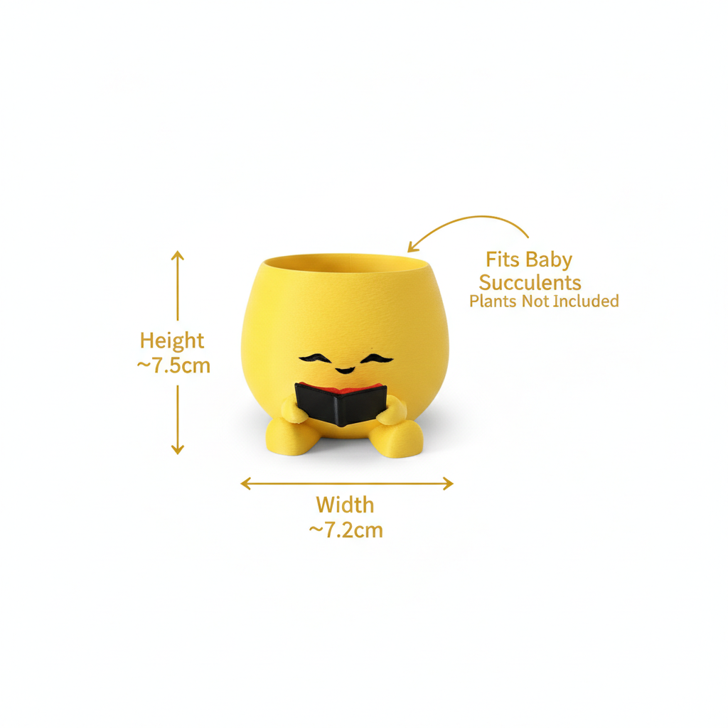 Adorable 3D printed character planters with happy book-reading faces – the ultimate desk companions for baby succulents! Get one Yellow and one Purple in this charming set.